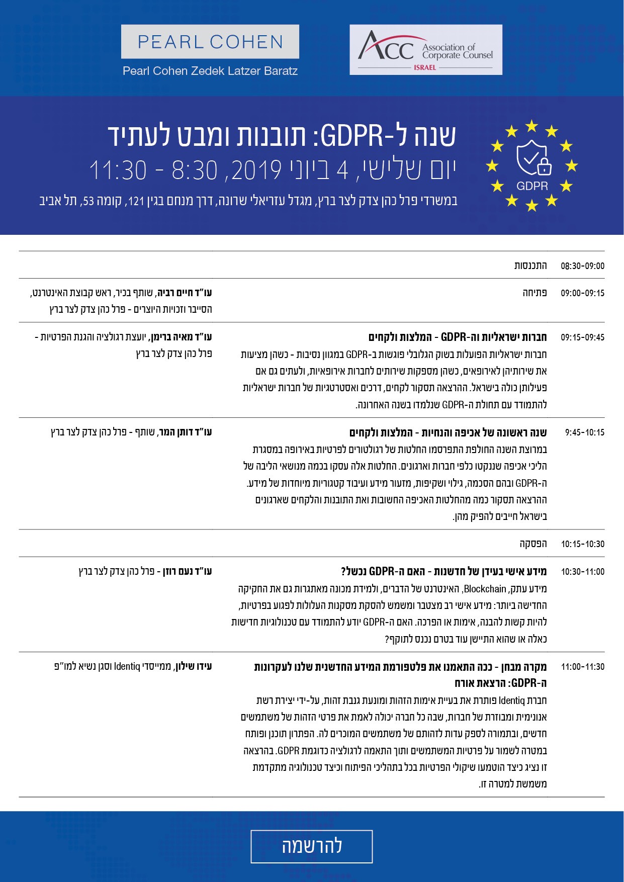 במלאות שנה ל-GDPR, נערוך כנס לקחים ותובנות ב- 4/6 במשרדי פרל כהן בקומה ה- 53 שלך עזריאלי שרונה: מה יכולות חברות ישראליות ללמוד מהשנה הראשונה ליישום התקנות האירופאיות? אילו הנחיות רגולטוריות פורסמו בשנה זו ומה צריכים אירגונים בישראל ללמוד מהם? איך מתמודד ה-GDPR עם טכנולוגיות חדשניות וכיצד התמודדה חברה יצירתית עם דרישות הפרטיות הקפדניות, כשפיתחה מערכת לזיהו המסתמכת על מידע מאירגונים רבים? על כל אלה ויותר, בכנס. מהרו להירשם כי מספר המקומות מוגבל והביקוש גדול. להרשמה, הקלק כאן.