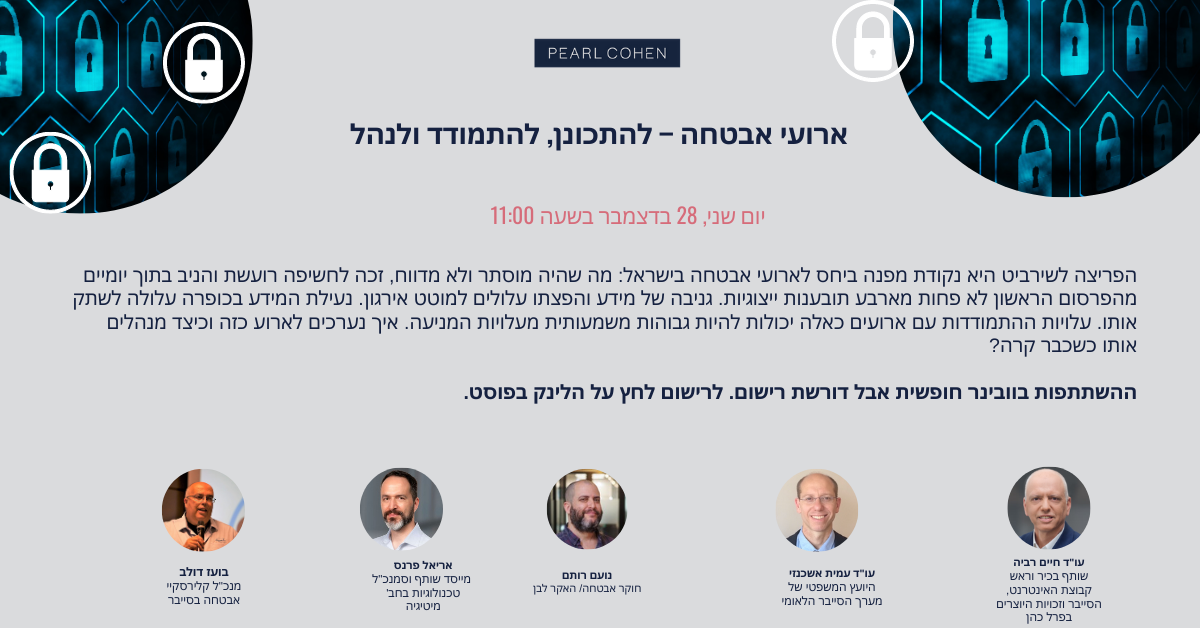 אחרי שנים של שקט מדומה, פריצות למידע בישראל מקבלות כותרות: ההתרחשויות בשירביט, עמיטל והאבנה לאבס הזניקו את תשומת הלב לארועי אבטחה לשיא חדש. איך להיערך לארועי אבטחה ולנהל אותם? וובינר בהנחייתי (עו"ד חיים רביה) עם היועץ המשפטי של מערך הסייבר הלאומי, עו"ד עמית אשכנזי; ההאקר לבן וחוקר האבטחה, נועם רותם; מייסד-שותף וסמנכ"ל הטכנולוגיות במיטיגה, אריאל פרנס ומנכ"ל קליר סקיי אבטחה בסייבר, בועז דולב - ביום שני 28/12 בשעה 11:00. להרשמה (חינם כמובן) - https://www.eventbrite.com/e/132775169105